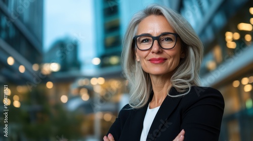 A confident senior woman with stylish gray hair stands with crossed arms, embodying authority and grace, set against a twilight cityscape, emphasizing leadership.