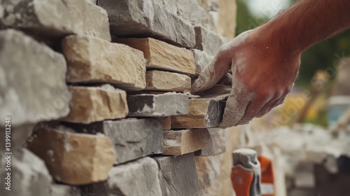 A construction site mason laying stone for an exterior wall. Featuring craftsmanship and attention to detail
