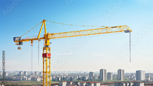 A construction site with a towering crane is set against a clear blue sky, illustrating the ongoing building activities in progress.