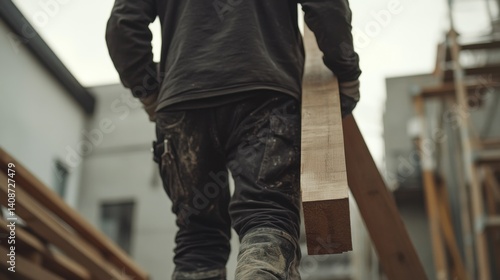 A construction worker carrying a wooden beam across a building site. Featuring beam transport and structural work