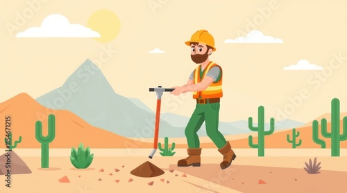 A construction worker digs in a desert landscape with cacti and mountains in the background.