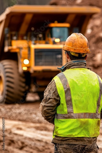 A construction worker examines an industrial dump truck on site.