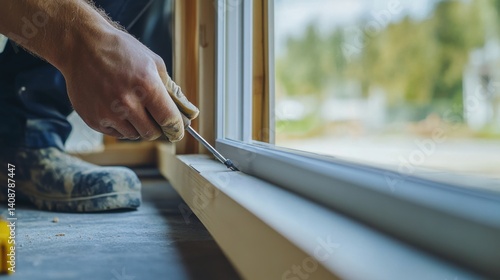 A construction worker installing a window frame in a building. Featuring craftsmanship and precision