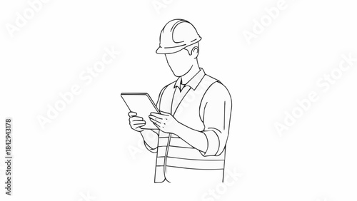A construction worker is looking at a tablet in front of a white background. It represents work and construction and also reflects the use of new technology in the engineering industry
