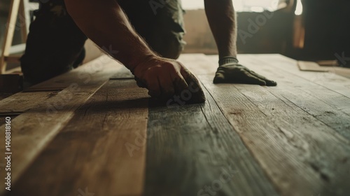 A construction worker laying down wooden flooring. Featuring detail and craftsmanship