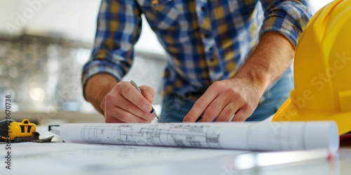 A construction worker reviewing blueprints with tools on a site, showcasing careful planning and precision in building projects.