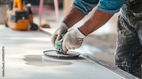 A construction worker sanding drywall at a construction site. Featuring finishing work and sanding