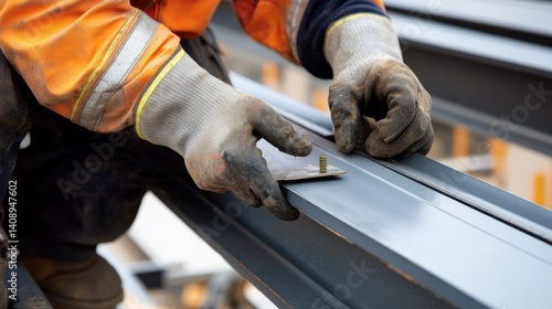 A construction worker securing a roof beam in place at a building site. Featuring focus and skill