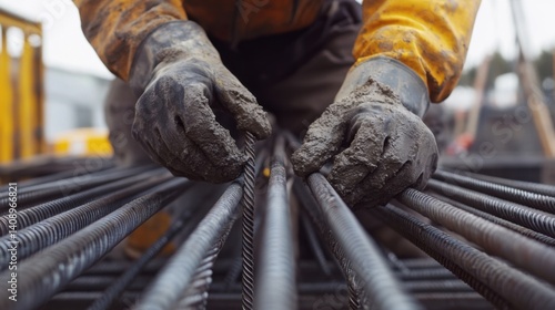 A construction worker securing metal rebar for concrete work. Featuring technical expertise and focus