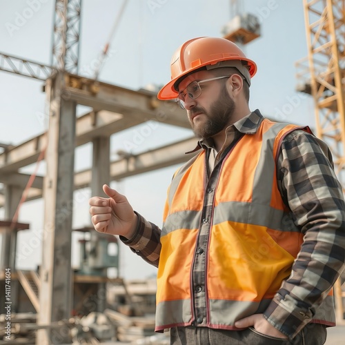 A construction worker wea a safety vest and hardhat thoughtfully observes a large-scale building project underway on a bright sunny day.