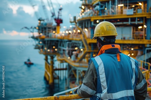 A construction worker wearing blue and white safety gear stands in front of an oil rig with cranes on the horizon, looking out at sea. The background shows another large industrial structure.
