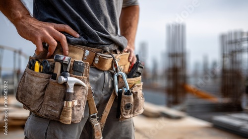 A construction worker's waist with safety harness and tool belt securely fastened