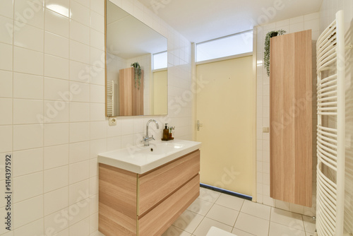 A contemporary bathroom featuring stylish wooden cabinetry, a sleek sink, and bright tile walls, creating a fresh and inviting atmosphere.