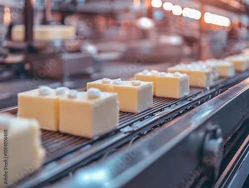 A conveyor belt with packaged dairy products ready for shipment, Dairy Distribution, Efficient and clean