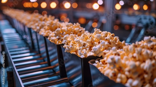 A conveyor line filled with freshly popped popcorn in a modern factory, under industrial lights, ready for packaging and distribution, highlighting the efficiency of food production.