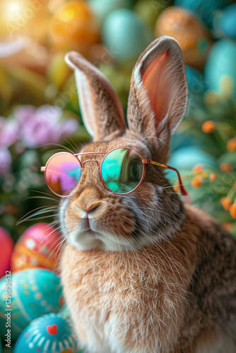 A cool easter rabbit with sunglasses and colorful easter eggs in the background