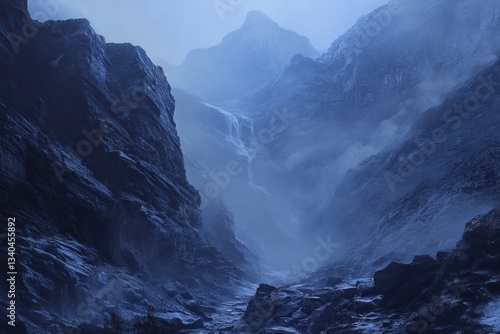 A cool, moody scene with deep blues and grays dominating the misty canyon.
