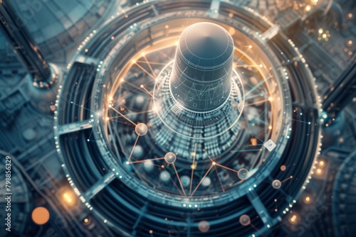 a cooling tower nuclear power station with icons of atoms with molecules and chemical element , symbols, in the style of bokeh panorama