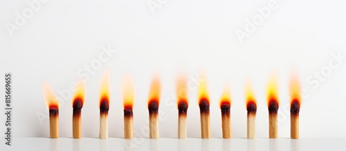 A copy space image of a row of three matches one of which is lit burning on a white background