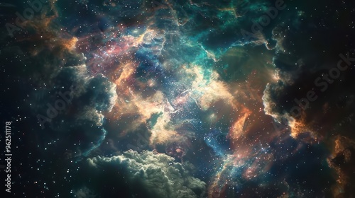 A cosmic nebula with swirling gas clouds and sparkling stars.