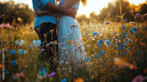 A couple embraces in a vibrant wildflower field during sunset, capturing a moment of love and tranquility amidst the colorful blooms.