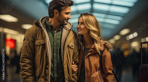A couple in love, standing side by side at an airport,eagerly awaiting their next adventure together