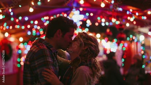 A couple kissing under the mistletoe at a holiday party, surrounded by twinkling lights and festive decorations.