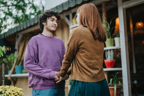 A couple stands outside a quaint building, holding hands and sharing a moment of connection amidst potted plants and a warm atmosphere.