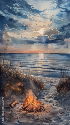 A cozy campfire burns on a sandy beach under a dramatic sunset sky.