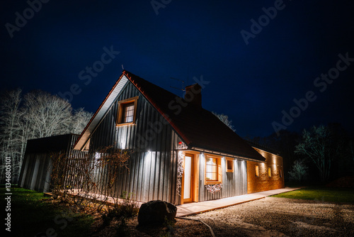 A cozy countryside house with a wooden facade is illuminated at night. Warm lights highlight the rustic design, surrounded by trees and a peaceful natural setting under a dark blue sky..