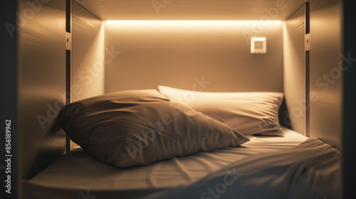 A cozy, illuminated small bed with pillows, captured in warm, soft light giving a luxurious sense of relaxation and comfort.