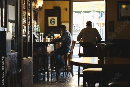 A cozy Irish pub scene with wooden furniture, traditional decor, and a bartender serving drinks amid vibrant conversations.