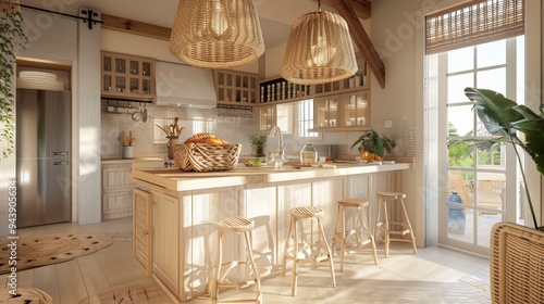 A cozy kitchen featuring natural elements and warm lighting, ideal for cooking and gatherings.