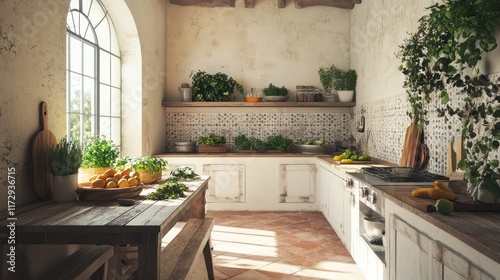 A cozy kitchen filled with fresh herbs and vegetables, emphasizing a natural cooking environment.