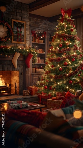 A cozy living room with a glowing fireplace and a decorated Christmas tree surrounded by gifts, creating a warm and joyful holiday atmosphere.