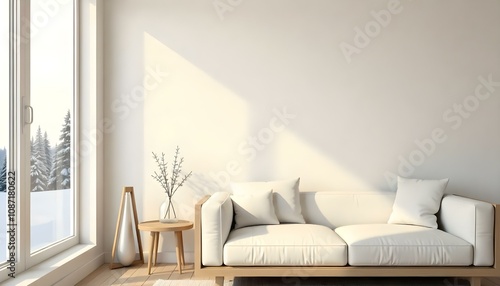 A cozy living room with a white sofa, wooden furniture, and a large window overlooking a snowy landscape