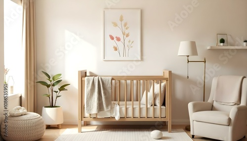 A cozy nursery with a wooden crib, a framed floral artwork on the wall, and various decorative elements like a plant and a white lamp