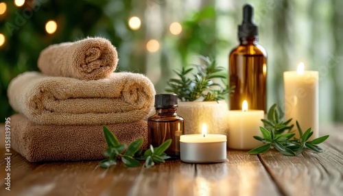 A cozy spa setup with candles, essential oils, and soft towels, Aromatherapy, Relaxing and indulgent