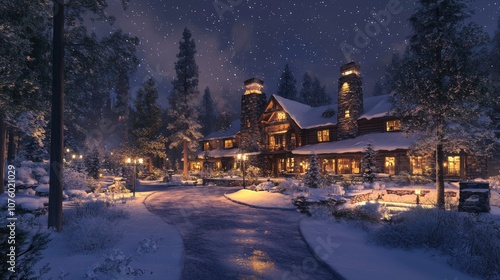 A Cozy Stone Lodge Nestled in a Snowy Forest at Night