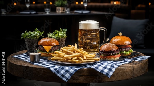 A cozy wooden table showcases street-style French fries, juicy burgers, and a tall glass of beer, all bathed in warm natural light, inviting food lovers