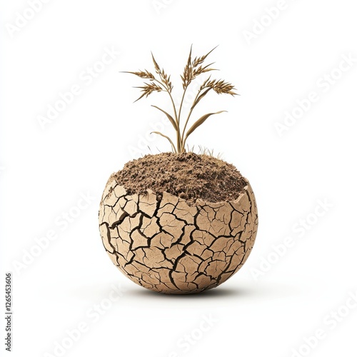 A cracked earth sphere with a small plant sprouting from the top symbolizes resilience and hope in a barren landscape.