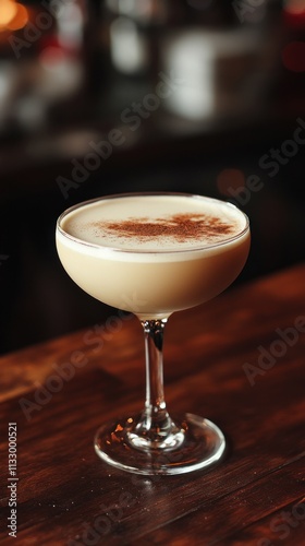 A creamy cocktail served in a stylish glass, garnished with a dusting of spice.