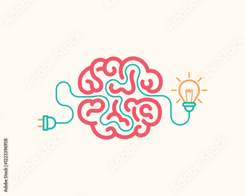 A creative illustration featuring a brain connected to a light bulb via a power plug, symbolizing ideas, creativity and activation.