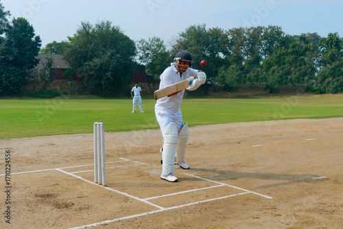 A cricketer in white uniform poised to hit a ball, with a wicketkeeper and fielder on a cricket field