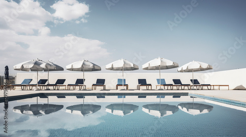 A crisp, blue sky above a deserted swimming pool, with lounge chairs and umbrellas neatly arranged around the pool's edge, ready for summer visitors. Minimalistic. Close up.
