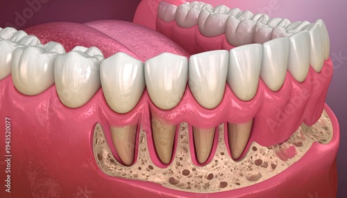A cross-section anatomical view of teeth, gums, bone, and tongue