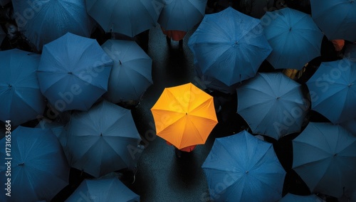 A crowd of people holding black umbrellas, with one person in the center holding an orange umbrella