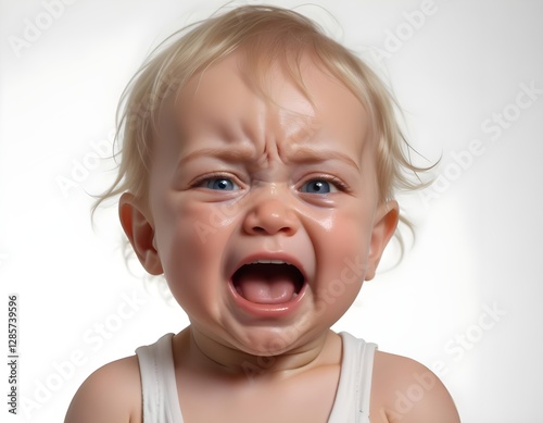 A crying baby with light skin, blonde hair, and a distressed facial expression