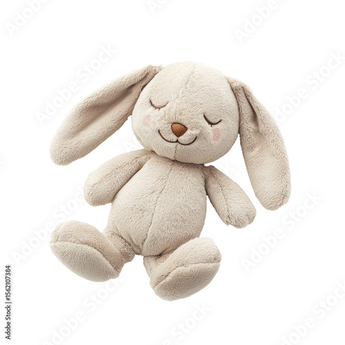 A cuddly baby bunny plush with long floppy ears, curled up in a snug, sleeping position. isolate on transparent background