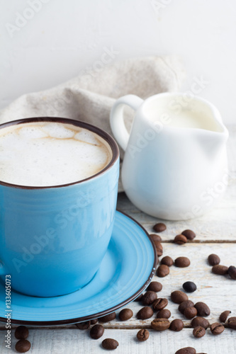 a cup of cappuccino and a milk jug